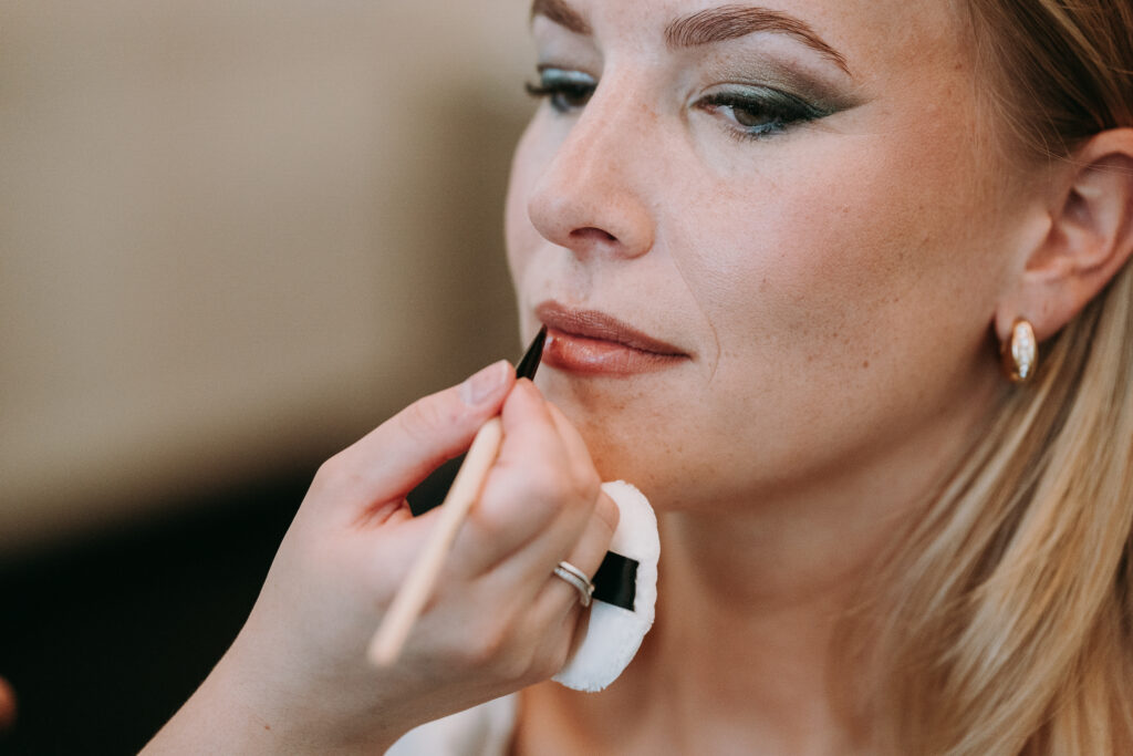 Un trait de liner glissé au ras des cils supérieurs, prolongé vers les tempes, renforce cette illusion d’œil allongé. Le regard est encadré par un halo diffusé de vert fumé en ras de cils inférieur, et intensifié par plusieurs couches de mascara volume pour un effet œil-de-sirène captivant.